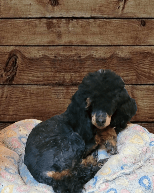 Maxx is not quite a toy but not quite a mini poodle. He is between 11-12 lb. A beautiful black phantom boy with dark intense copper markings! He has a sweet, goofy personality and he loves his people!